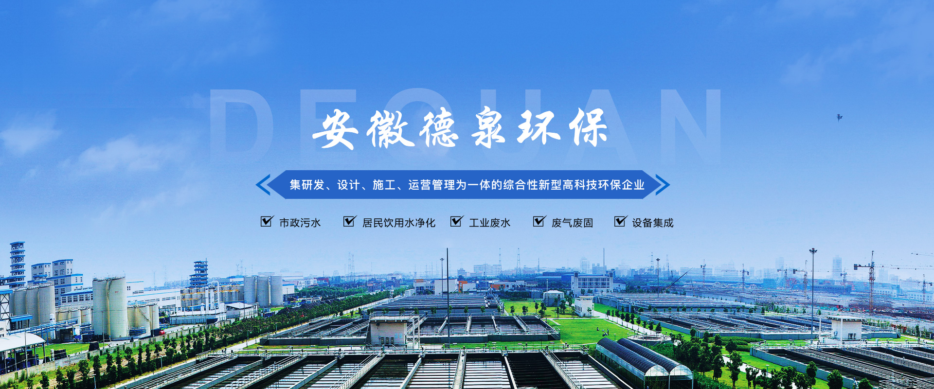 安徽德泉環(huán)保科技有限公司致力于廢水、廢氣、固廢技術(shù)處理研發(fā)、設(shè)計(jì)、施工及運(yùn)營管理,從事環(huán)保設(shè)備及設(shè)施的制造和銷售,為環(huán)保項(xiàng)目系統(tǒng)提供專業(yè)的技術(shù)咨詢和服務(wù)。是一家集建筑勞務(wù)分包,工程總承包(EPC)、項(xiàng)目投資(BOT/PPP)、運(yùn)營管理(O&M)于一體的綜合性新型高科技企業(yè)。